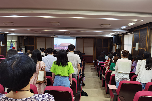 全体在家校领导和党群部门负责人在图书馆一楼报告厅组织收看庆祝大会