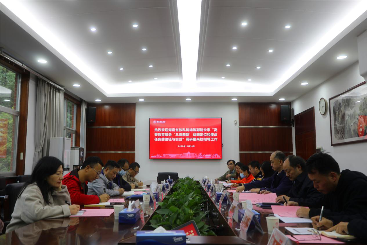 (记者 肖晔 易璇)11月14日下午,省教科院副院长杨敏率“高等教育服务‘三高四新’战略定位和使命任务的路径与实践”课题组来我校调研。副校长杨震出席调研座谈会。会议由发展规划与学科建设处副处长孙雄辉主持。
