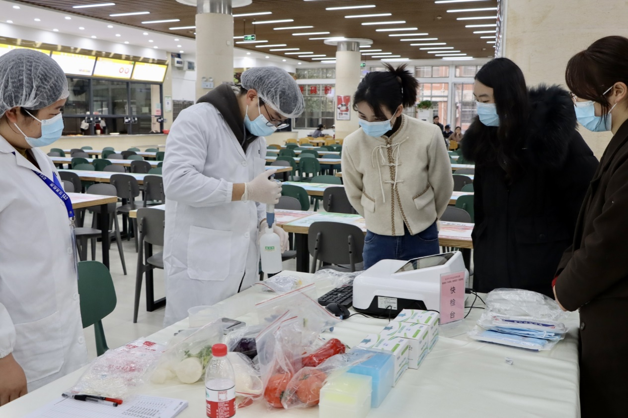 刘怀德现场指导相关食材快检,并与学生代表进行交流。他对学校餐饮卫生服务工作表示肯定,对大家的辛勤付出表示感谢。他表示,学校始终高度重视食堂安全监管工作,要不断提高食堂服务质量水平,保障广大师生饮食健康安全。