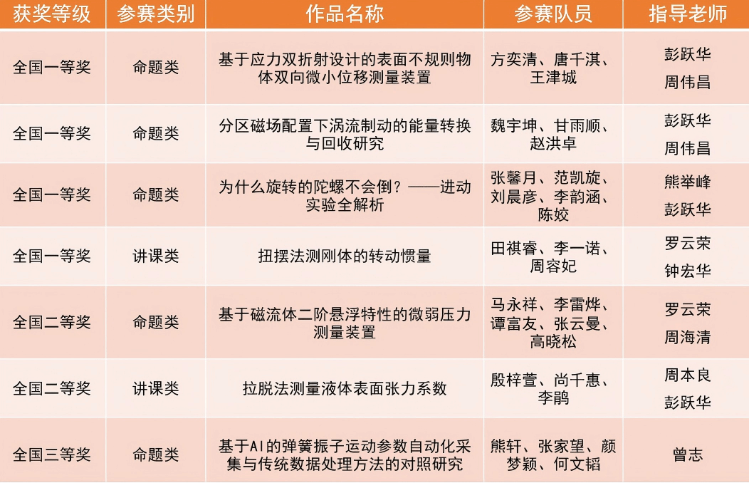 我校物电学院自今年2月启动备赛工作,共组建7支参赛队伍。各队伍在指导老师的悉心指导下,围绕选题开展多轮实验论证与方案优化。经全国初赛严格评审,5支队伍成功晋级决赛,其中4支队伍斩获一等奖,展现了我校学子扎实的物理实验功底与创新能力。长期以来,物电学院将指导学生参与高水平学科竞赛作为实验教学环节的重要组成部分,持续优化实验课程体系,拓展科研项目参与渠道,着力培养学生创新思维与实践能力。