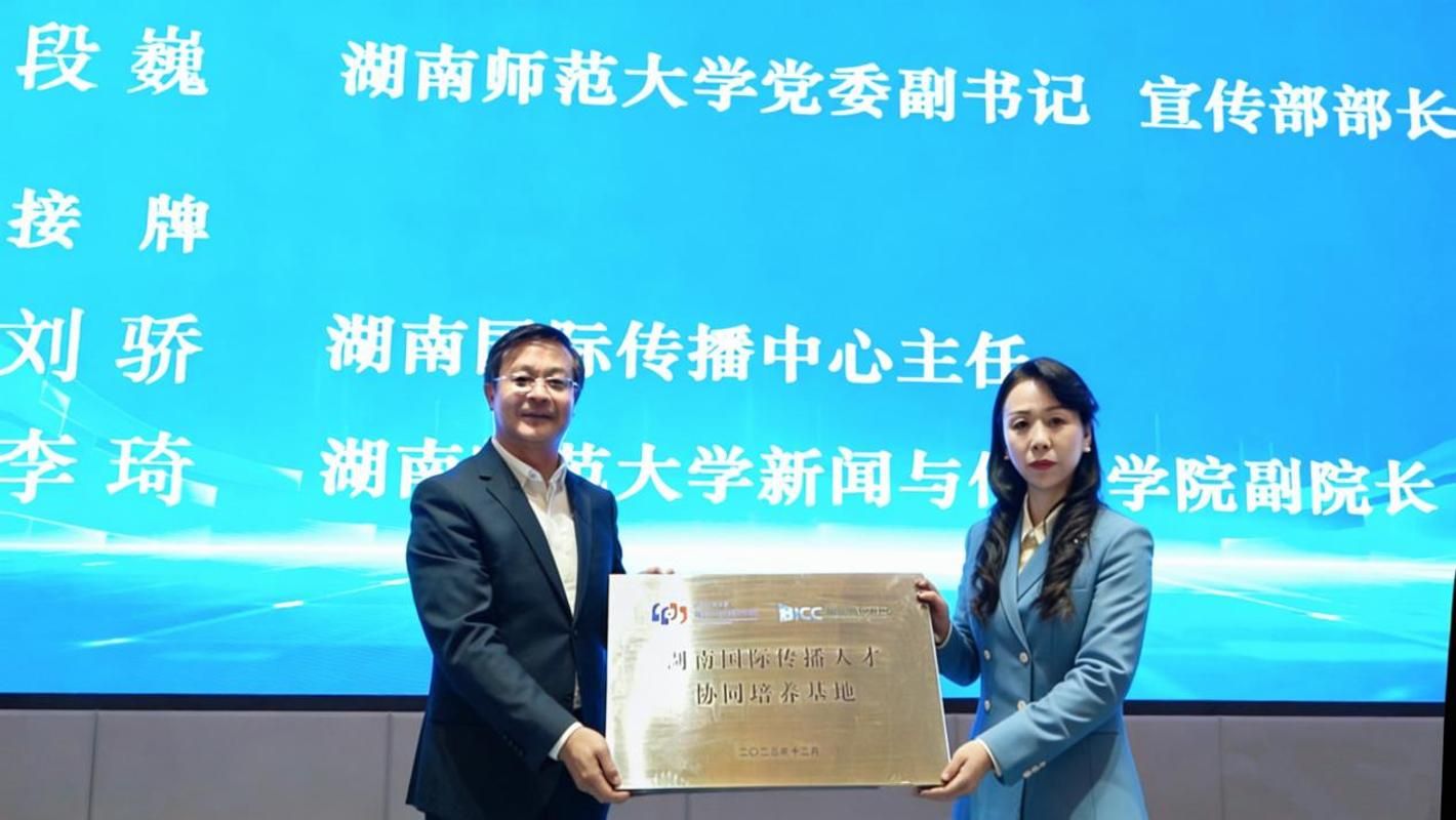 开幕式举行了“湖南国际传播人才协同培养基地”授牌仪式。段巍向湖南国际传播中心、我校新闻与传播学院相关负责人授予基地牌匾,标志校地双方在国际传播人才协同培养方面的合作正式启动。
