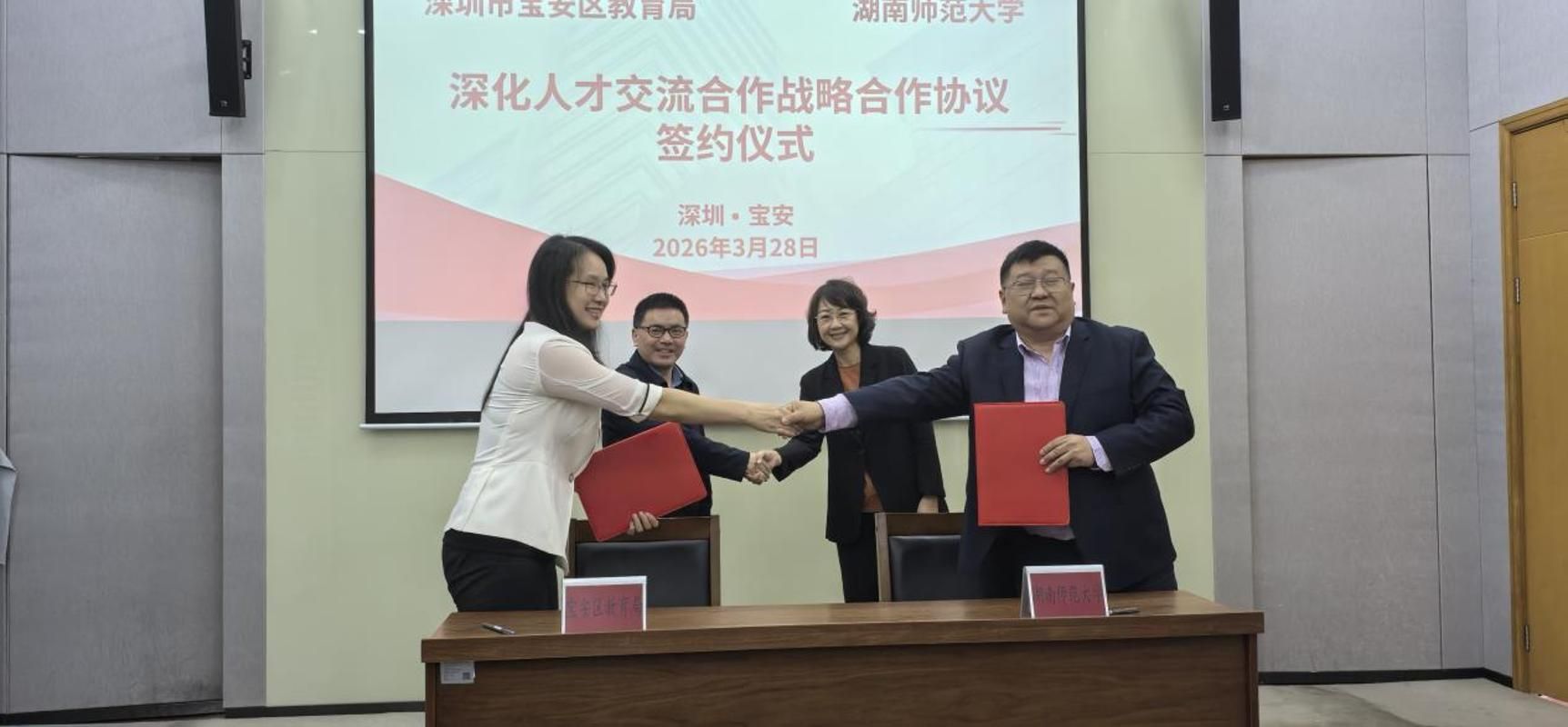 28日下午,《湖南师范大学与深圳市宝安区教育局深化人才交流合作战略合作协议》签约仪式在宝安区教育局举行。在签约座谈会上,宝安区委教育工委书记、区教育局党组书记、局长王曦充分肯定我校历届毕业生在宝安教育中作出的贡献,期待进一步深化区校合作。郑贤章感谢宝安区对我校毕业生的厚爱,并表示学校将坚守立德树人根本任务,遵循守正创新路径,为社会培养更多优秀人才。会后,深圳海韵学校集团党委书记、我校音乐学院1986级校友何云陪同郑贤章一行参观腾讯明湾学校和宝安前湾学校。