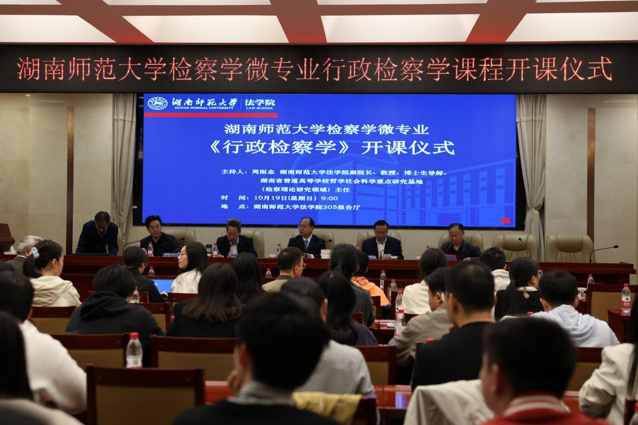 (记者 周赛 钟扬)10月19日上午,我校在法学院205报告厅举行检察学微专业《行政检察学》课程开课仪式。最高人民检察院检委会委员、行政检察厅厅长张相军,湖南省人民检察院副检察长谈固,我校副校长刘怀德出席仪式,我校法学院副院长周刚志主持仪式。