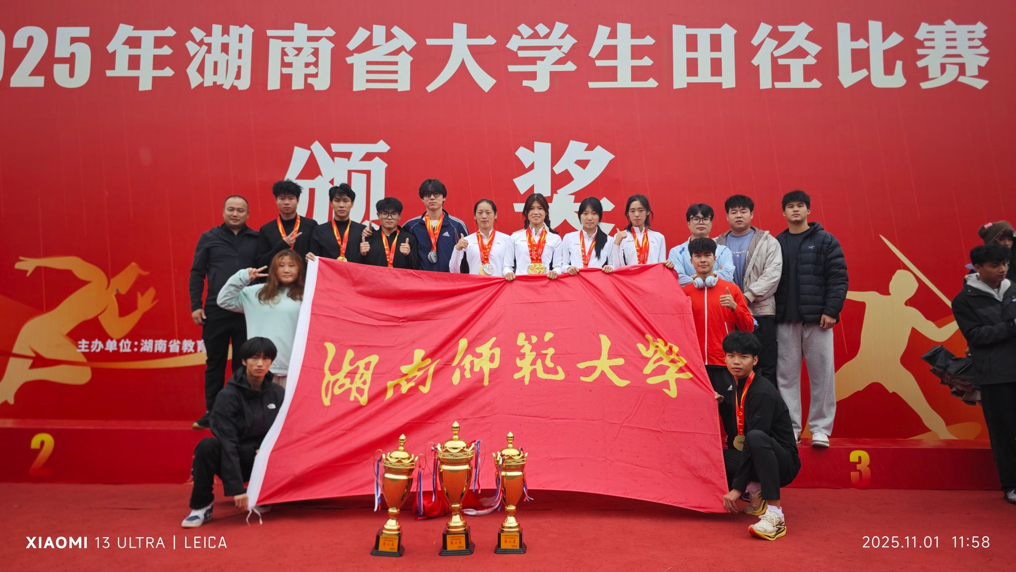 (供稿 体育学院)10月26日至11月1日,2025年湖南省大学生田径锦标赛在湖南科技大学举行。我校运动员奋勇拼搏,共斩获10金10银7铜和多个单项名次,荣获男女团体总分第二,男子团体第二和女子团体第二的佳绩。
