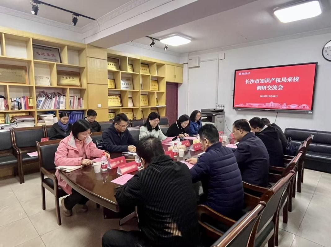 长沙市知识产权局党组成员、副局长徐拥军,四级调研员李丽刚,运用促进处处长曹磊,长沙知识产权保护中心办公室主任罗晓兴,科学技术处技术转移中心与学校国家知识产权信息服务中心相关工作人员参加座谈交流。