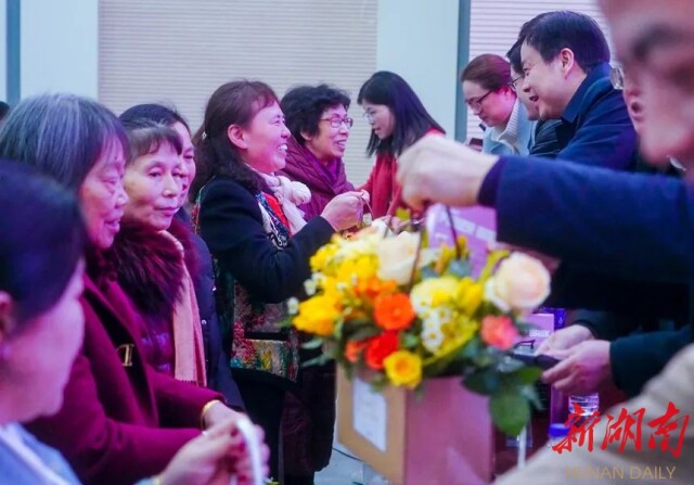 (校领导们女教职工母亲赠送鲜花和礼物。)