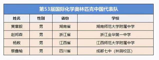 第 53 届国际化学奥林匹克中国代表队队员选拔赛已结束,第 53 届国际化学奥林匹克竞赛中国国家队出炉!根据选拔办法的要求,对 50 名集训队学生进行理论和实验考试及综合考察。根据集训期间学生考试成绩和综合考察结果,最终选出以下 4 名选手代表中国参加第 53 届国际化学奥林匹克竞赛。