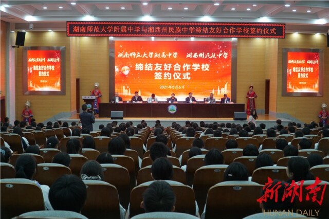 湖南日报·新湖南客户端5月6日讯(记者 李孟河 通讯员 向丽 陈曦)今天下午,湖南师范大学附属中学与湘西土家族苗族自治州民族中学缔结“友好合作学校”签约揭牌仪式,在吉首举行。湘西州政府副州长吴凌频,湖南师大附中校长谢永红,湖南师大附中党委书记黄月初,湘西州教体局党组书记、局长田勇,湘西州民族中学党委书记郑英滨、校长彭学军出席仪式。