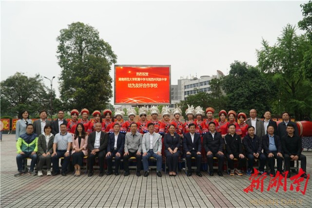 仪式上,湖南师大附中校长谢永红与湘西州民族中学校长彭学军签订友好学校协议;双方共同为两校结为“友好合作学校”揭牌。仪式前,与会人员参观了校园,观看了土家族摆手舞展演。