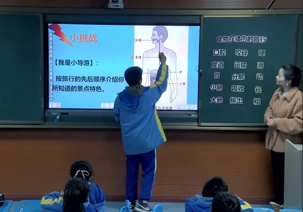 科学学科张清云老师在《食物在体内的旅行》这堂课中融合交互式电子白板优势设计课堂环节,主要引导学生完成三个“旅行任务”,利用手机同屏展示学生作品,同时加入课堂游戏活跃学习氛围,通过“翻翻卡”“蒙层”等技术让课堂更生动有趣。