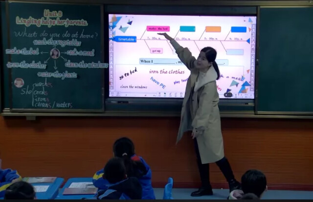 英语学科熊美清老师充分利用白板软件的音频、视频、图片、蒙层、课堂活动等功能进行词句新授,通过连线达人让学生上台进行词句配对,思维导图功能让学生根据关键词初步复述课文,课堂活动分组竞赛突破教学难点,利用翻翻卡创设不同情境进行分组表演,播放视频以及蒙层填空引出本课核心素养。英语学科吴舒敏老师的课用自己录制的vlog、蒙层、放大镜、四线三格工具功能充分调动学生的多方位感官,增强知识教授的趣味性,并通过多屏互动功能及时、直观地展示学生习作——时间作息表,点评、反馈并引导学生自主总结、归纳。