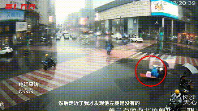 老人腿有残疾,他坐在独轮小木板上,靠一只脚蹬地过十字路口,身前还推着他拾来的废纸箱等。雨越下越大,老人没有打伞,穿着也很单薄。