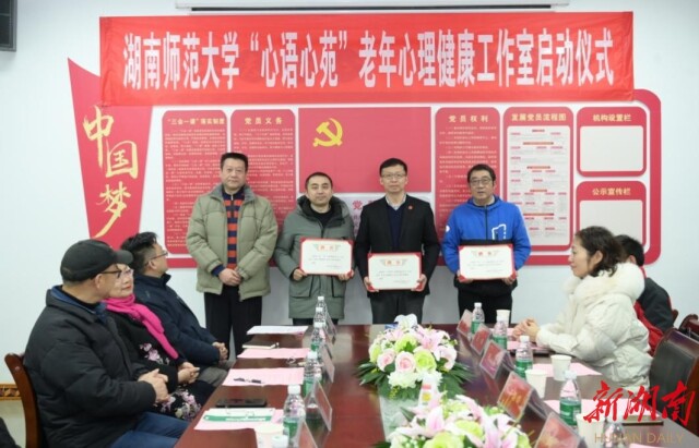 大众卫生报•新湖南客户端1月11日讯(通讯员 方俊雄)近日,湖南师范大学“心语心苑”老年心理健康工作室启动仪式在桃花坪校区老年活动中心举行,活动旨在践行健康中国战略,关爱学校老年人身心健康。
