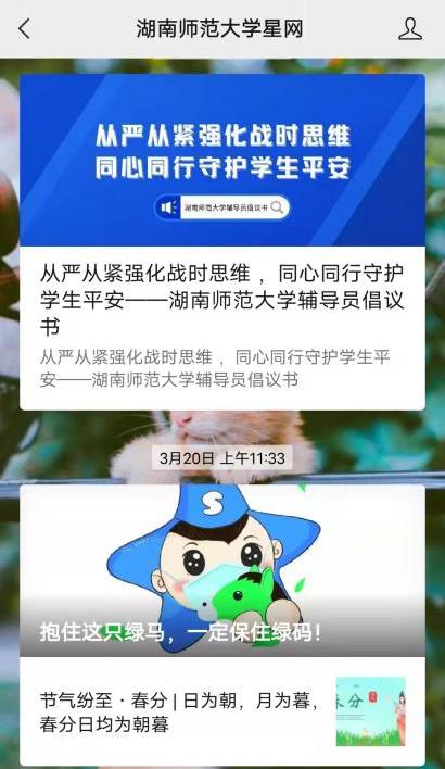 加强学生思想引领,充分做好疫情防控宣传工作。通过湖南师范大学星网、湖师小团子等平台,及时发布《湖南师范大学辅导员倡议书》、“疫情防控rap”“湖师大春季在校防疫指南”,推出“星夜读”等防疫专题栏目,深入挖掘奋战在抗疫一线的辅导员事迹,广泛宣传报道,引导广大师生坚定必胜信心、科学自我防护,共同战胜此次疫情防控斗争。