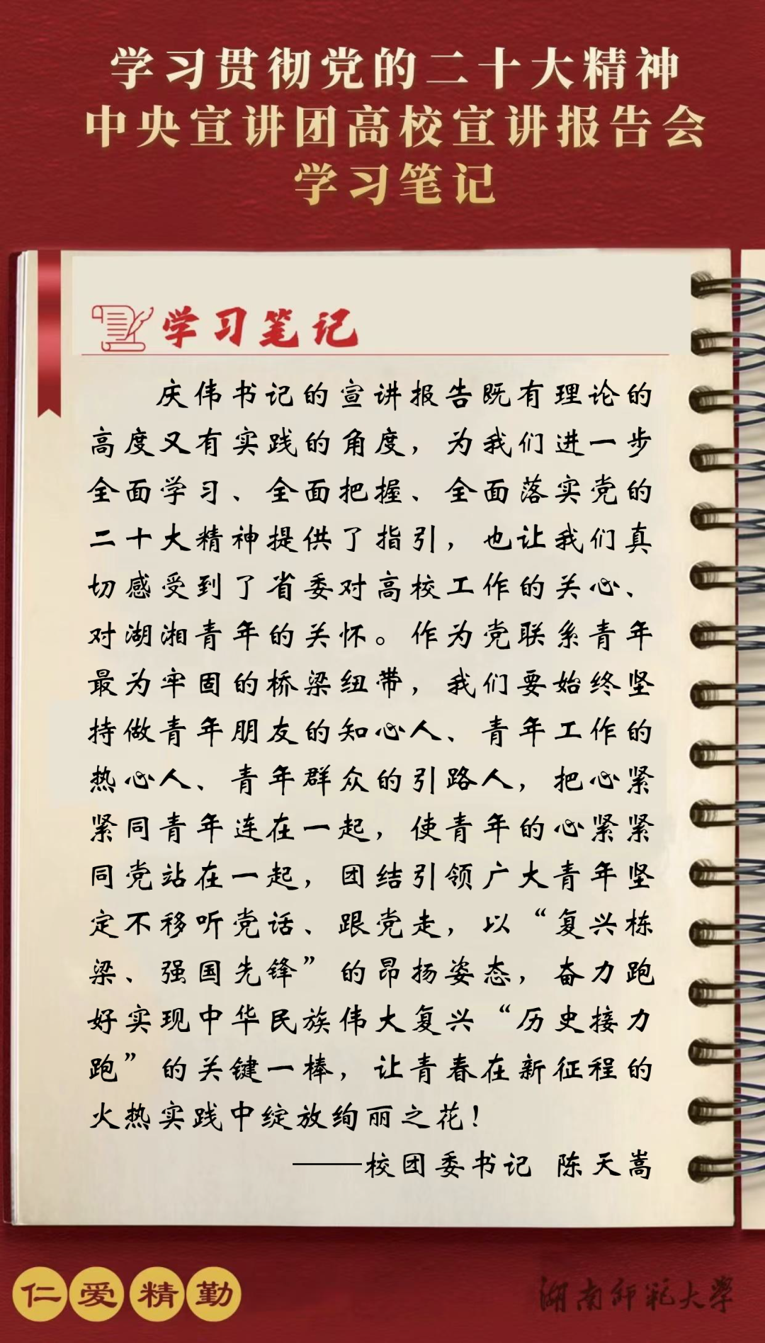 红网时刻新闻11月7日讯(记者 潘锦 设计 蒋蝶 蔡财文)根据党中央统一部署,11月4日,中央宣讲团成员、湖南省委书记、省人大常委会主任张庆伟来到湖南师范大学,宣讲党的二十大精神。省有关单位负责同志、湖南师范大学校领导班子成员、在长有关高校主要负责人及师生代表等参加。