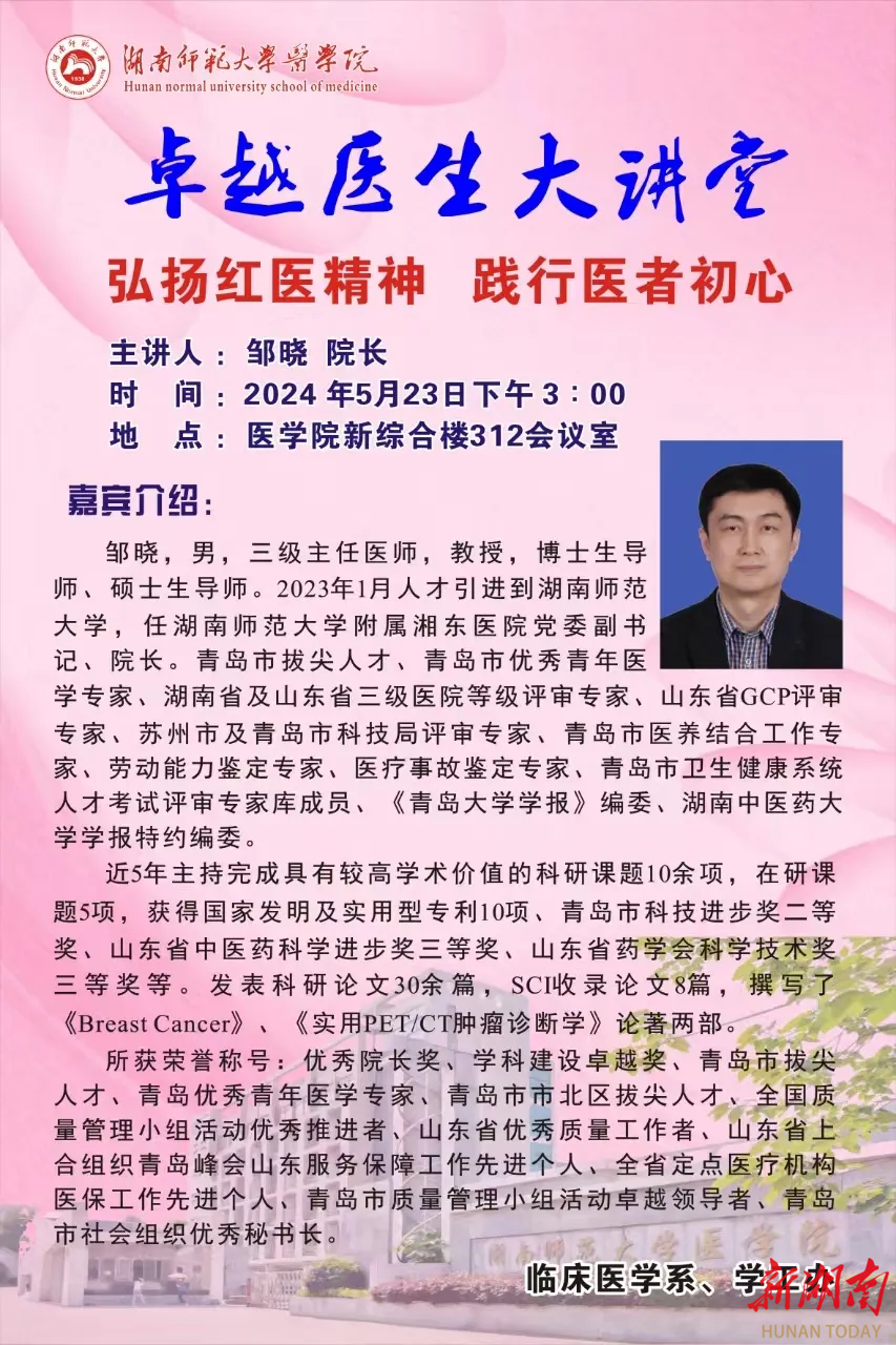 大众卫生报·新湖南客户端5月24日讯(通讯员 钟雨芹 徐虹)为将红色资源优势转化为育人优势,发扬光荣传统,传承红医精神,不忘初心,提升医学生医德修养,让红医精神在新时代依旧散发光芒。5月23日下午,湖南师范大学博士生导师、附属湘东医院党委副书记、院长邹晓应邀,以“弘扬红医精神,践行医者初心”为题,为湖南师范大学医学院的学生上了一堂别开生面的思政课。湖南师范大学医学院党委书记鄢朝晖参加活动。