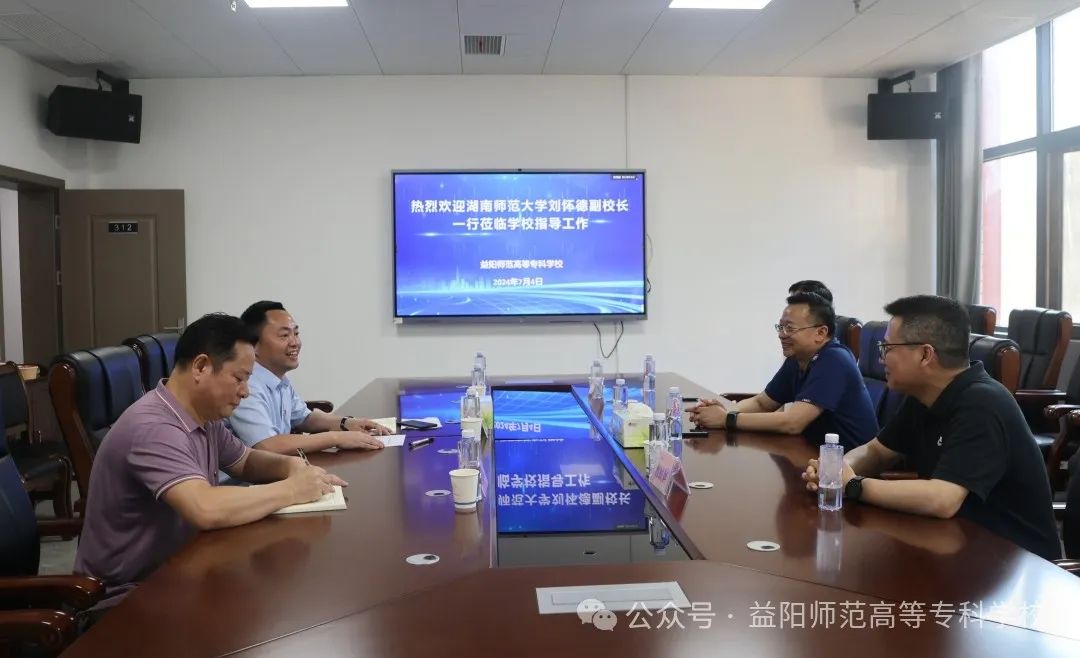7月4日,湖南师范大学党委委员、副校长刘怀德一行来益阳师范高等专科学校调研。益阳师范高等专科学校党委书记李梦醒、校长鲁良以及相关部门负责人陪同调研。
