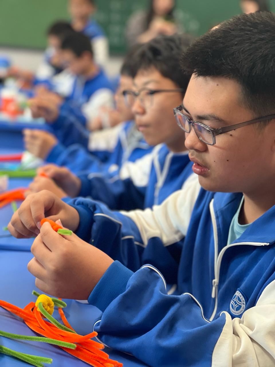 在自我介绍环节,黎筱叶妈妈向同学们展示了自己多角色多职业的斜杠多彩人生,打破了孩子们对单一职业的刻板印象。同学们全神贯注地聆听,认真观察,跟着黎筱叶妈妈学习“柿柿如意”的制作方法并积极提问。黎筱叶妈妈耐心专业的讲解,让课堂充满了欢声笑语。同学们充分发挥想象力和创造力,团结协作,互帮互助,共同探索着扭扭棒的奇妙世界。手工制作完毕,我们举办了一场别开生面的作品展示会,同学们依次上台展示自己的手工作品,分享自己的创作理念以及创作过程中的趣事。这不仅让孩子们体验了手工制作所带来的成就感,更增强了他们的自信心和参与感。