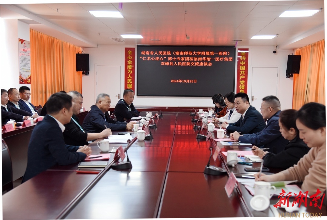 新湖南客户端10月29日讯(通讯员曹景 刘霞 周丽)10月24日—25日,湖南省人民医院党委书记赵卫华率“仁术心连心”博士专家团一行17人走进南华附一医疗集团双峰县人民医院,开展座谈、讲学、科普教育及义诊等一系列活动,为双峰县医疗卫生系统带来了管理及业务上的新观点新技术新理念,深受大家欢迎。