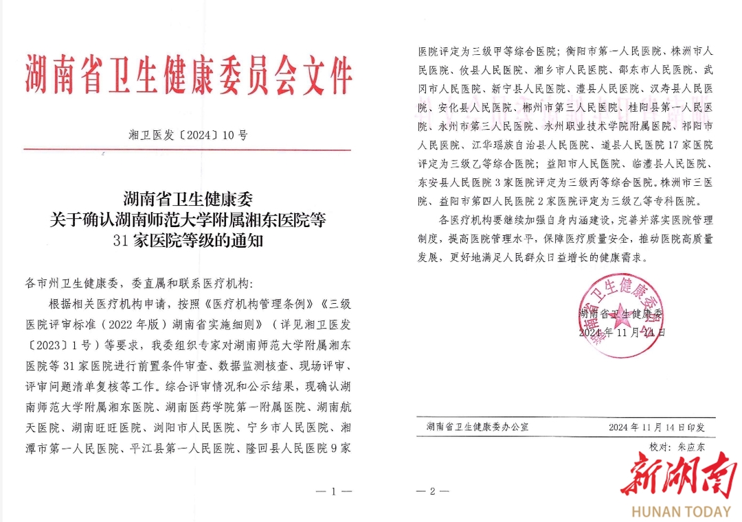 大众卫生报·新湖南客户端11月26日讯(通讯员 徐虹 刘朝晖)11月14日,湖南省卫生健康委员会下发《关于确认湖南师范大学附属湘东医院等31家医院等级的通知》(湘卫医发〔2024〕10号),湖南师范大学附属湘东医院被确认为三级甲等综合医院。