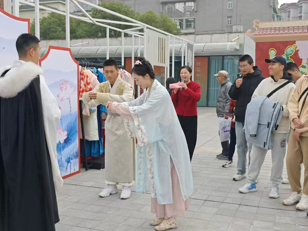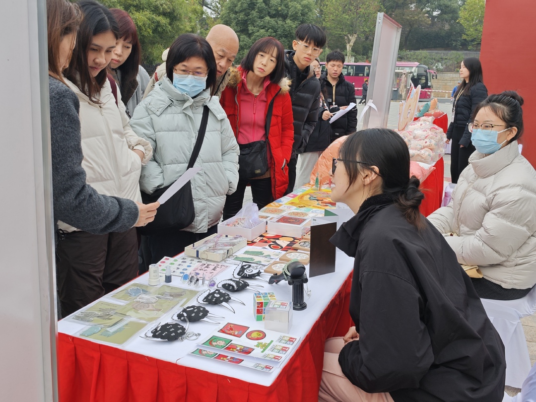 另一边,“汉风新礼”活动专区,以汉文化体验为核心,居民们在礼仪老师的带领下穿汉服、习汉字、行汉礼”,沉浸式感受汉文化的魅力。“这湘有礼”文创产品展区展示了湖南师范大学美术学院带来的艺术设计学系文创产业研究课程成果,同学们以湖南博物院文物为灵感,创作出系列各具特色的文创产品,吸引了众多居民驻足观赏。“铜趣乐园”IP互动游戏区更是深受“大朋友和小朋友”的喜爱,玩投壶、铜趣钓钓乐游戏,在现场做手工还原文物形态,拼拼图、领奖品,免费品尝画糖人、糖油粑粑等美食,玩得不亦乐乎。