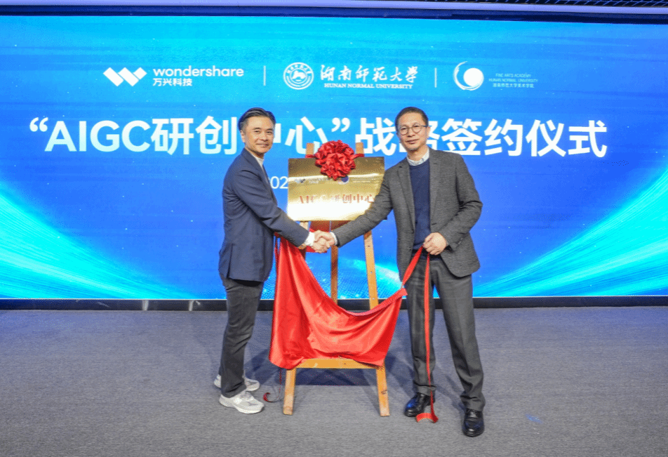 在全场嘉宾的见证下,双方代表签署战略合作协议并共同揭牌。此次签约与揭牌,是湖南师范大学美术学院与万兴科技积极响应国家“人工智能+”行动计划,深入推进“AI+艺术”融合的重要一步。AIGC研创中心的成立标志着校企合作进入实质性推进阶段。这一平台将突破传统艺术教育的边界,通过课程共建、项目共研、成果共享的创新机制,打造产学研用一体化的示范样本。未来,AIGC研创中心将深度融合湖南师大美院的艺术底蕴与人才储备,持续汇聚万兴科技的产业资源与技术优势,共同开展AIGC技术在艺术创作、设计应用等领域的创新探索,为推动数字创意产业发展和艺术教育变革注入持久动力。