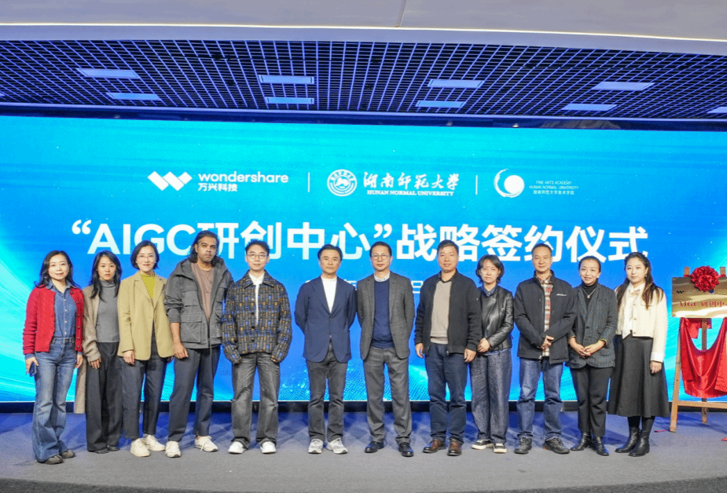 (通讯员 贺雨欣 王颖琪 刘烨 戴梓珺)10月29日上午,万兴科技与湖南师范大学美术学院AIGC研创中心签约揭牌仪式在设计楼报告厅圆满完成。湖南师范大学美术学院院长、湖南省设计艺术家协会主席李少波,万兴科技集团副总裁张铮,湖南师范大学美术学院副院长刘湘东,万兴科技集团品牌部负责人俞建腾,创意总监Shaan等双方代表出席,学院师生、企业团队成员及媒体代表百余人共同见证。