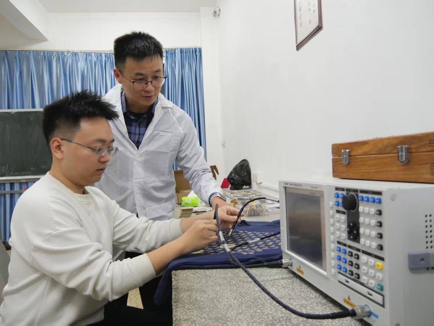 刘柱(右)和团队成员对拓扑服装进行测试。王昊昊 摄