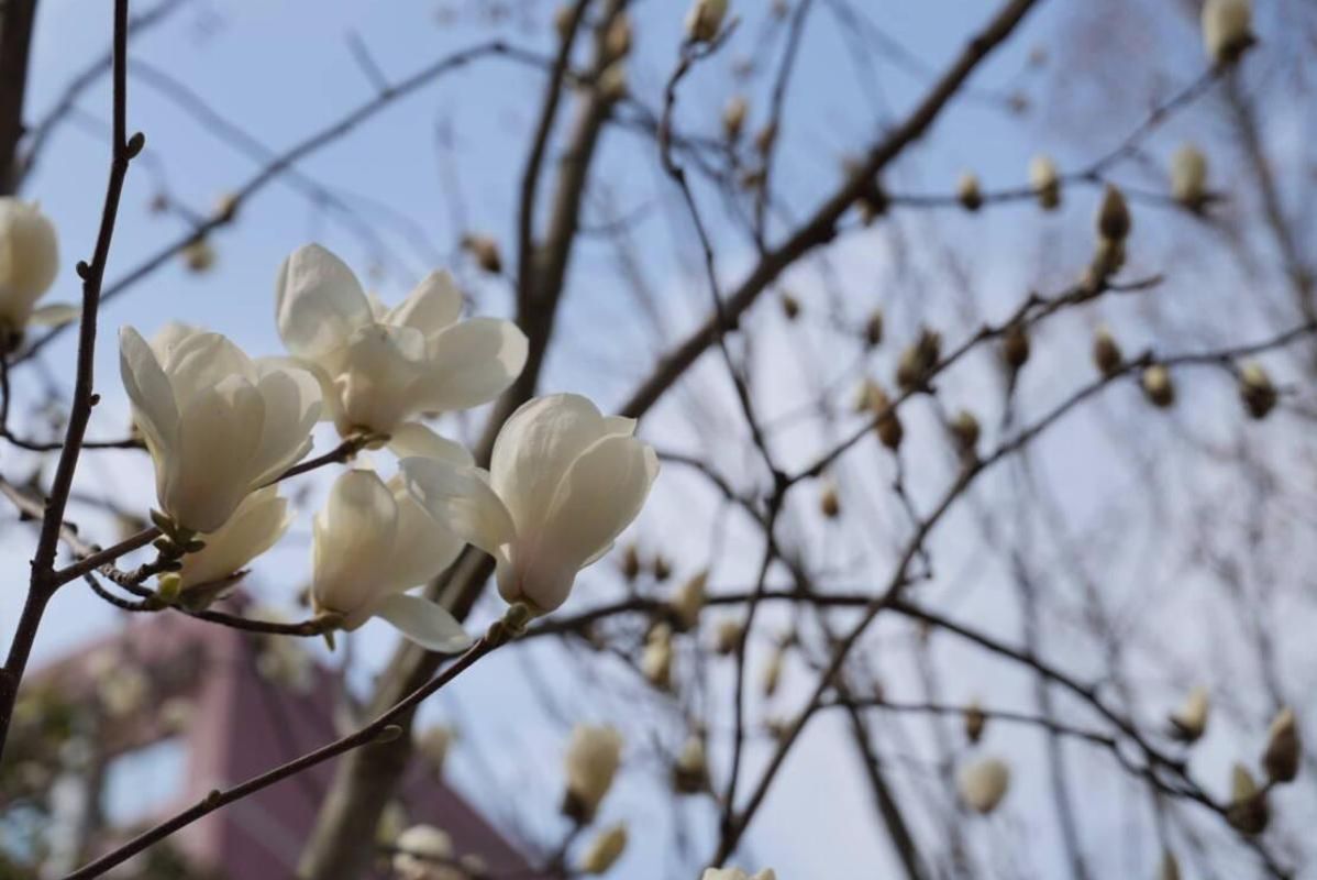 木兰路上,玉兰挺拔参天,尚未生叶的枝桠向天空舒展,托起满树繁花。远望如积雪栖枝,似白鸽停驻,又像一树树云朵绽开。从此时时春梦里,师大人心中,应添一树女郎花。